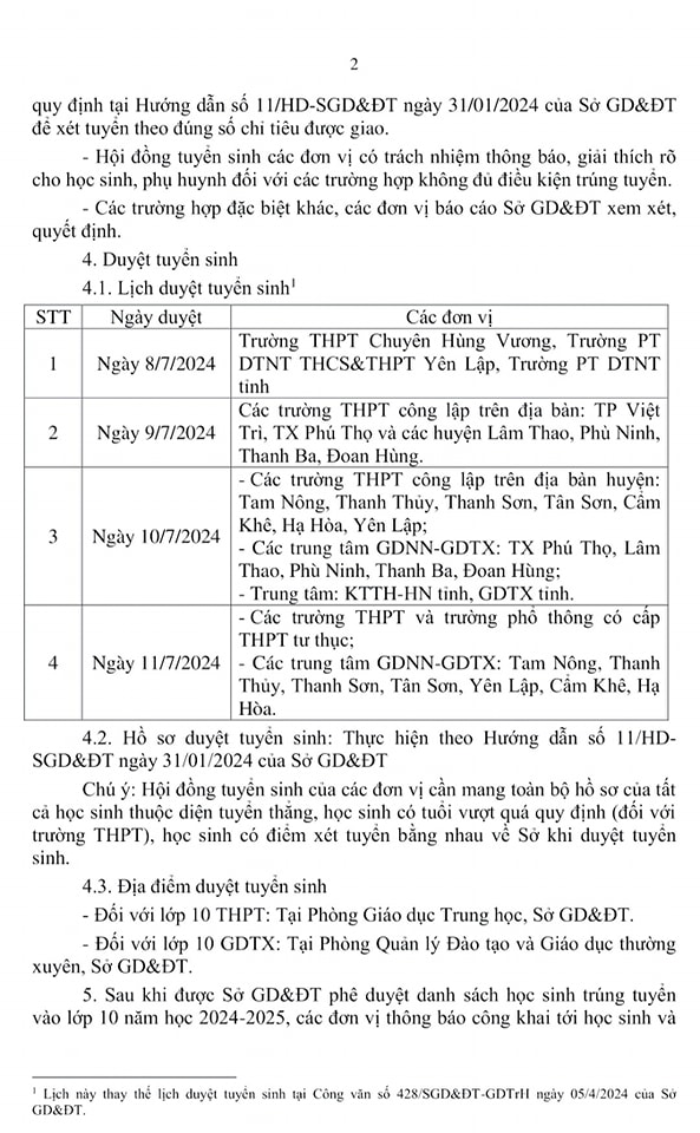 THỜI GIAN NỘP HỒ SƠ CỦA THÍ SINH ĐỦ ĐIỂM XÉT TRÚNG TUYỂN: Thực hiện theo Thông báo số 869/SGD&ĐT-GDTrH (mục số 02 quy định về thời gian nộp hồ sơ đối với thí sinh đăng ký dự tuyển và đủ điểm trúng tuyển) của Sở GD&ĐT Phú Thọ (văn bản đính kèm bên dưới).
