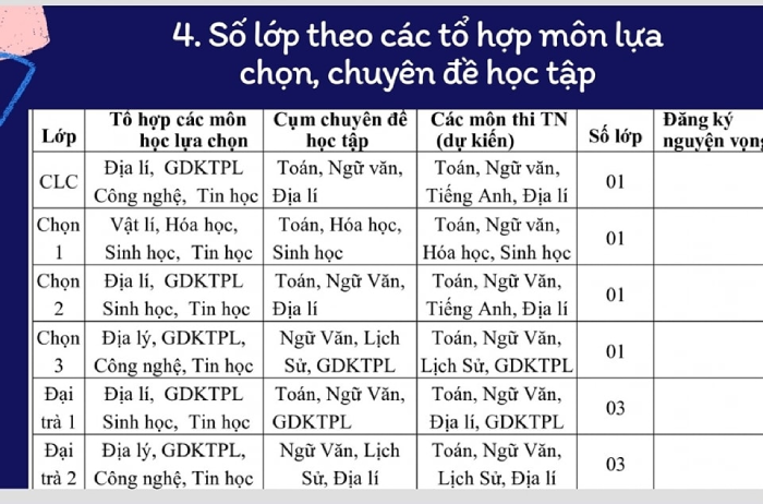 Căn cứ vào tình hình thực tiễn của trường về đội ngũ giáo viên, cơ sở vật chất, thiết bị dạy học, số lượng học sinh đăng kí Tổ hợp môn học nhà trường sẽ chủ động xét chọn, sắp xếp học sinh theo các lớp phù hợp với thực tiễn của trường và nguyện vọng của học sinh.