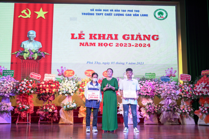 Cũng tại buổi Lễ, NGƯT Nguyễn Thị Thành Chung – Nguyên PGĐ Sở GD&ĐT Phú Thọ, PCT thường trực Hội khuyến học tỉnh Phú Thọ đã trao học bổng 1+N cho 2 em học sinh, bà Nguyễn Thị Minh Thọ – PCT Hội khuyến học thành phố trao học bổng Tiếp sức cho em đến trường cho 03 học sinh có hoàn cảnh khó khăn. Lãnh đạo nhà trường cũng đã tao tặng 49 suất học bổng cho các em có kết quả xét tuyển vào trường cao với số tiền 94 triệu đồng.